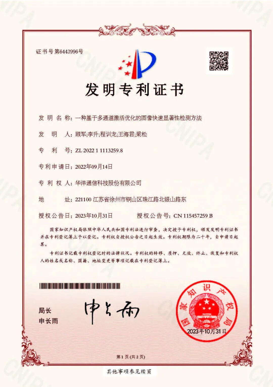 经国家知识产权局审批,122cc太阳成集团官网通信科技股份有限公司新获1项发明专利授权